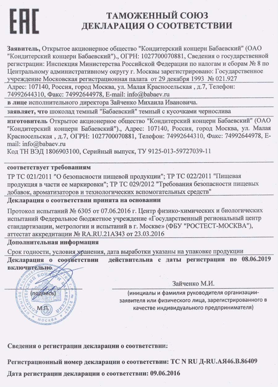 Сертификат соответствия на конфеты "Бабаевский" 2018/2019