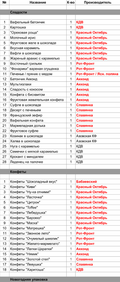 Вафельный батончик (1 шт), Картошка (1 шт), Нуга с карамелью (1 шт), Семечки с мягкой карамелью (1 шт), Крокант с миндалем (1 шт), Леденец на палочке (1 шт), Конфеты "Харитоша" (1 шт)