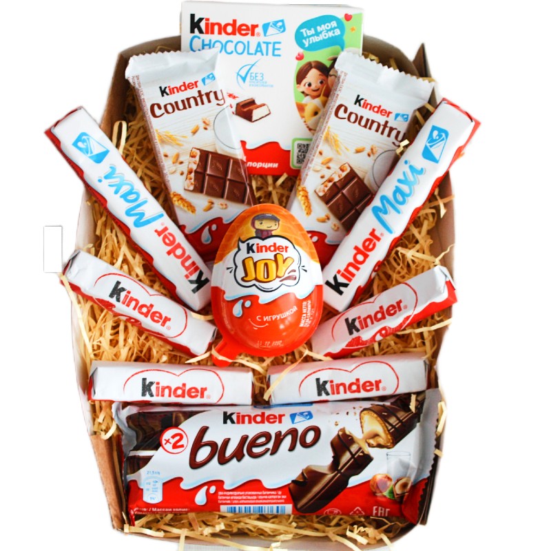 Kinder Bueno - 1 шт; Kinder Chocolate 50 gr - 1 шт; Kinder Maxi - 2 шт; Kinder Chocolate Stick - 4 шт; Kinder Country - 2 шт; Kinder Joy - 1 шт