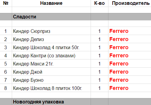 Киндер Сюрприз (1 шт), Киндер Делис (1 шт), Киндер Шоколад 4 плиток 50г. (1 шт), Киндер Макси 21 г. (1 шт), Киндер Кантри (со злаками) (1 шт), Киндер Джой (1 шт), Киндер Буэно (1 шт), Киндер Шоколад 8 плиток 100г. (1 шт)